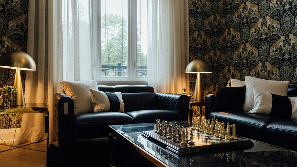 Metallic elements add a hint of luxury to a black-and-white living room without disrupting the color scheme. Gold, brass, or chrome accents—whether in the form of a sleek floor lamp, a metallic-framed mirror, or decorative objects—bring warmth and sophistication. A black-and-gold chandelier or silver-framed coffee table subtly enhances the contrast of the room while maintaining a refined, polished aesthetic.