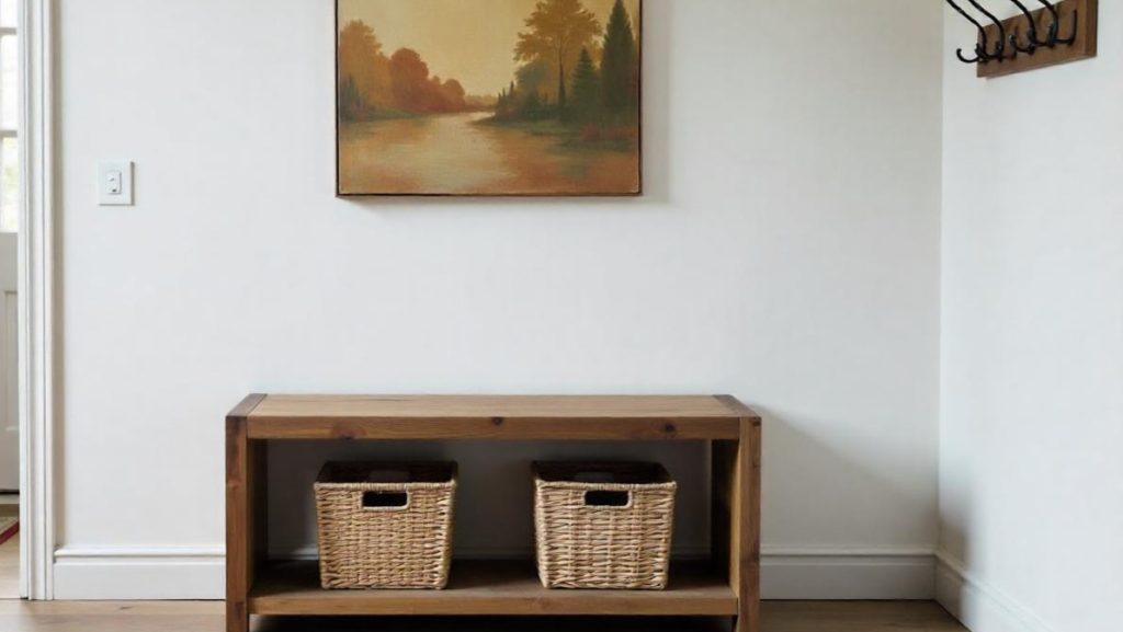 Perfect for warm, lived-in spaces, this rustic entryway invites both charm and order. The bench offers a comfy spot to sit while putting on shoes, and the baskets underneath are ideal for stashing scarves, pet leashes, or reusable bags. A few cozy throw pillows or a soft cushion can add extra comfort, while a vintage style coat rack or wall hooks keep jackets and hats handy. The natural textures like wood, wicker, maybe even a leafy plant or two, bring a calming vibe. It’s a welcoming, down-to-earth setup that feels as personal as it is practical.