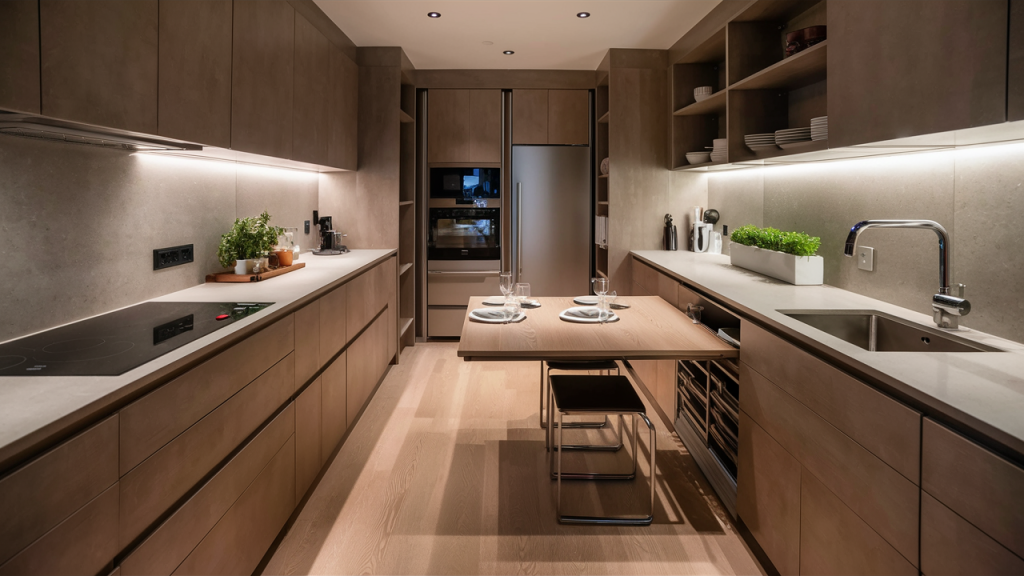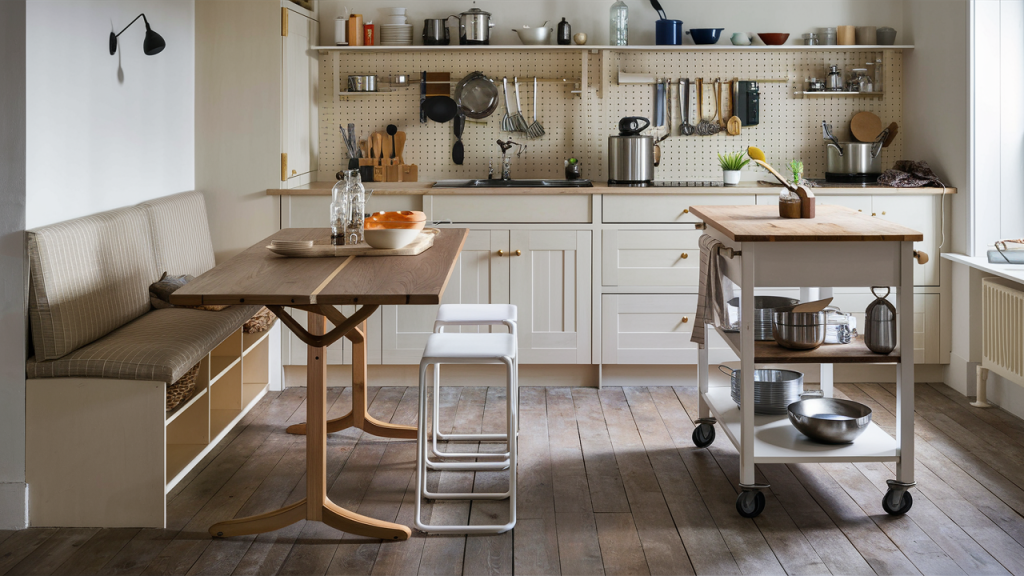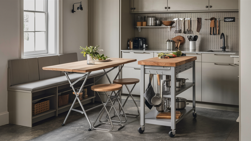 Small kitchens benefit from smart, dual-purpose furniture that maximizes functionality without taking up extra room. Foldable tables, rolling islands, or extendable countertops provide additional prep or dining space when needed, then tuck away seamlessly. Stools that slide under counters and built-in banquettes with hidden storage further optimize space, ensuring every inch serves a purpose without overcrowding the kitchen.