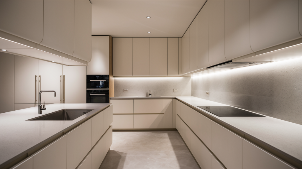 Handle-free cabinets create a seamless, modern look that prevents visual clutter in a small kitchen. Push-to-open mechanisms or integrated grooves keep cabinetry looking sleek while maintaining easy access. Glossy or matte finishes in neutral tones enhance the minimalist feel, making the space appear larger. This design trick works especially well in contemporary kitchens, where clean lines and simplicity are key.