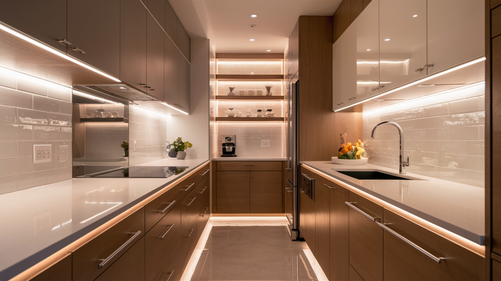 Proper lighting is essential in a small kitchen, and under-cabinet lighting helps brighten work areas while adding a modern touch. LED strips or puck lights illuminate countertops, reducing shadows and making meal prep easier. They also create a warm, inviting ambiance when dimmed in the evening. For added sophistication, opt for smart lighting that allows you to adjust brightness and color temperature based on the time of day.