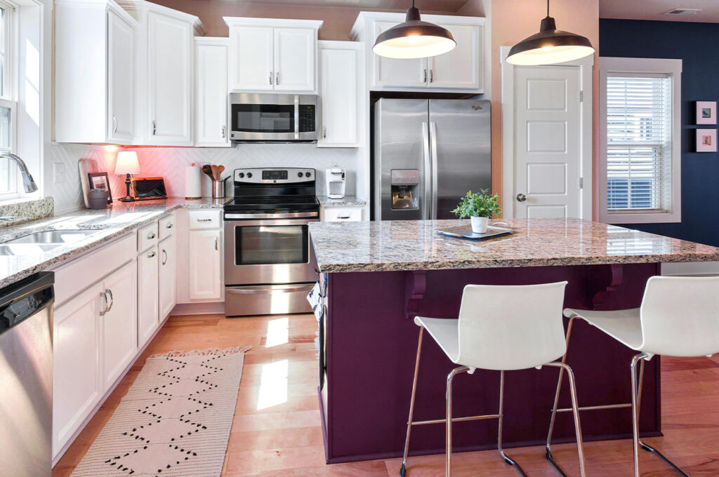 A vibrant kitchen island can completely transform the energy of your cooking space. Bright colors like cobalt blue, sage green, or cherry red make the island the visual anchor of the room. Against neutral cabinetry and countertops, a bold island adds contrast, personality, and a sense of custom design. It’s a great way to experiment with statement color in a functional area without committing to a full-room change.