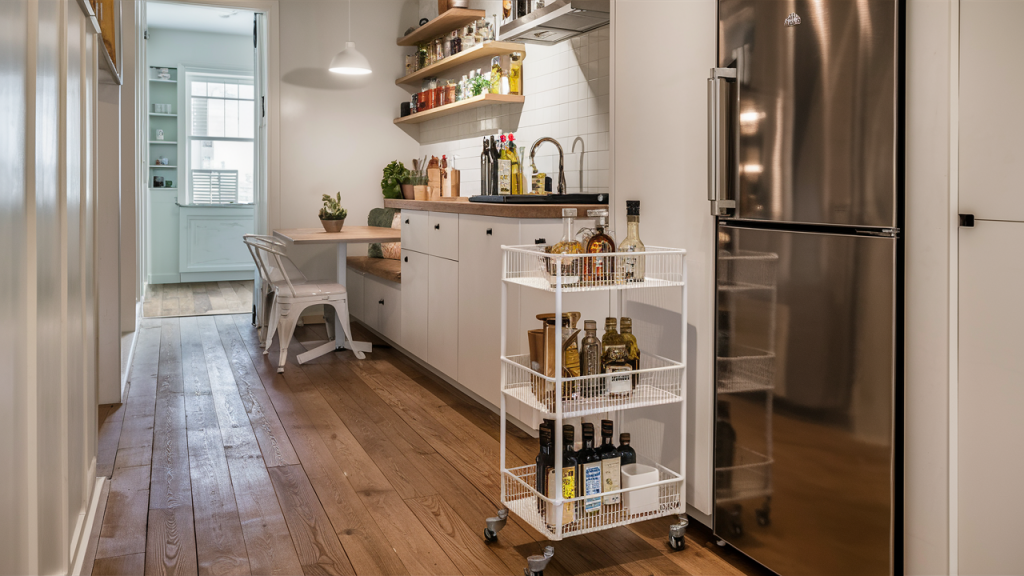Rolling carts are a small space staple. Their compact design and mobility make them ideal for holding anything from bathroom essentials to kitchen tools. When not in use, simply wheel them into a closet or unused corner. Look for slim, multi-tiered versions that can slide into tight spaces like between the fridge and wall or beside your desk.