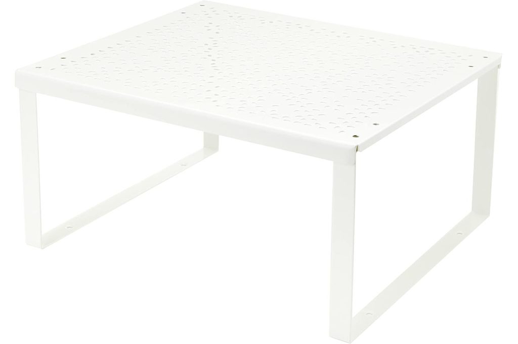 The VARIERA shelf insert features a sturdy metal frame with a clean white finish and a flat top surface made from a solid panel. Its open-bottom design allows it to sit neatly over smaller items, creating an upper tier within a cabinet or shelf. The structure is compact but stable, providing a simple way to divide vertical space and make use of underutilized areas. It’s especially helpful in kitchens or closets where stacking items directly can lead to clutter.