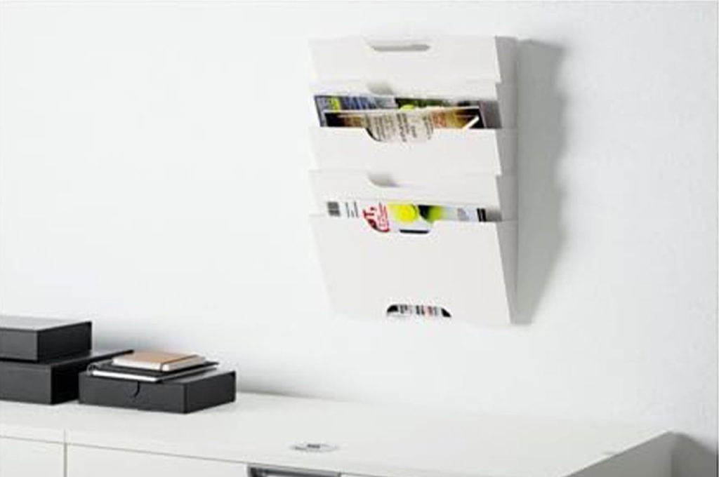 The Kvissle Wall Rack features a minimalist white metal design with clean lines, offering a modern and organized way to store items. Its open, compartmentalized structure provides easy access to magazines, papers, or even small decorative items. The vertical arrangement maximizes wall space, while the subtle style complements various room aesthetics. Perfect for decluttering workspaces or living areas, this wall rack brings both function and a touch of sleek simplicity to any space.