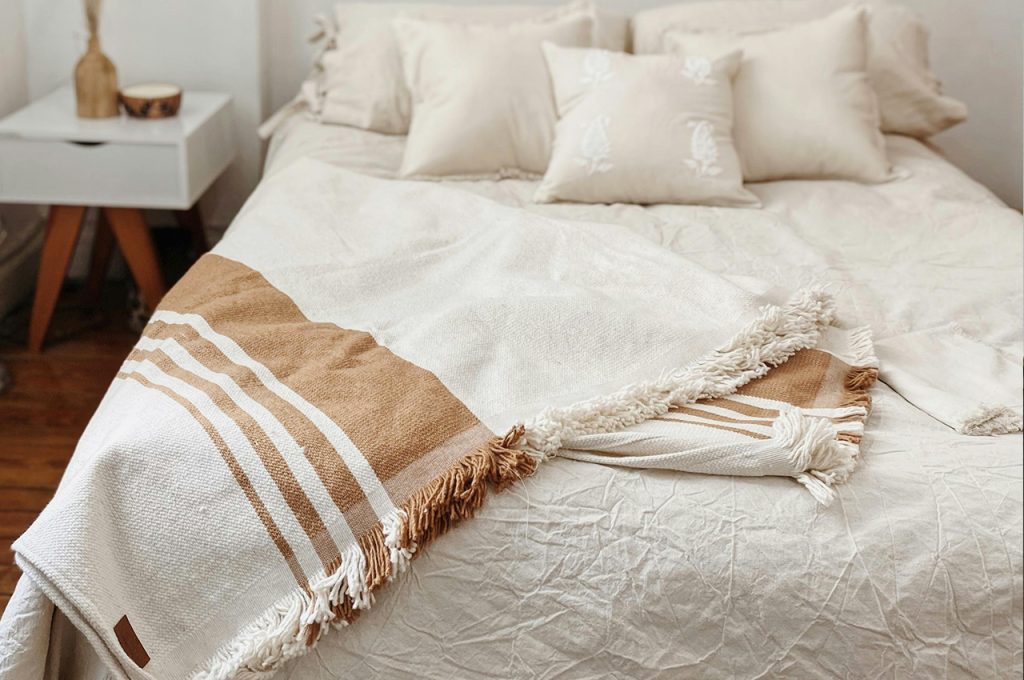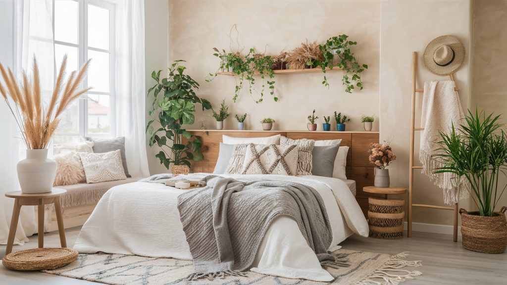 Nothing defines boho-chic better than a mix of soft, inviting textiles. Layered bedding with a blend of linen, cotton, and woven blankets creates a relaxed, lived-in feel. Adding decorative pillows in various patterns and textures enhances the bohemian charm while keeping the space comfortable. A lightweight canopy or a macramé bed throw introduces a dreamy aesthetic. Mixing neutral tones with warm, earthy hues keeps the look balanced yet inviting. Whether it’s a plush area rug or tasseled throws, textiles add depth and warmth, making the room feel effortlessly cozy.
