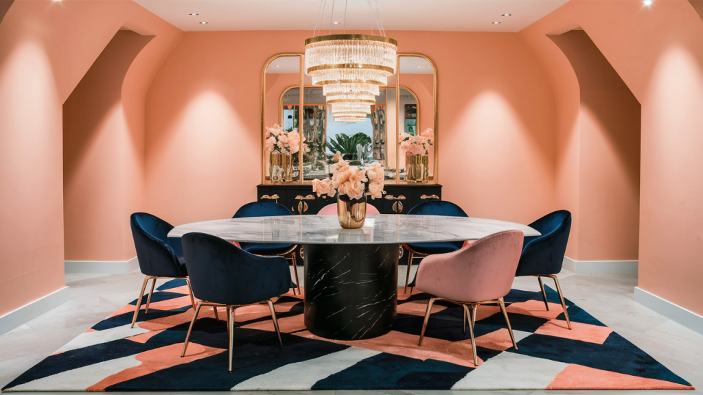 Peach brings warmth and softness, while deep navy adds a bold contrast, creating a look that’s both fun and refined. Use deep navy on statement walls, kitchen cabinetry, or large furniture pieces, while peach accents—such as pillows, vases, or drapery—add a cheerful touch. The balance between dark and light tones creates a sophisticated yet inviting space that feels fresh, youthful, and stylish.