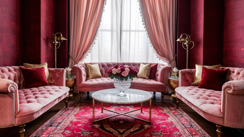 Rich burgundy adds depth and a touch of luxury, while pale blush keeps the space feeling soft and sophisticated. This pairing is perfect for those who love a mix of bold and delicate elements. Use burgundy in upholstery, drapes, or statement furniture, and balance it with blush walls, throws, or accent pieces. The contrast between deep and soft tones creates an effortlessly elegant and romantic atmosphere that feels both modern and timeless.