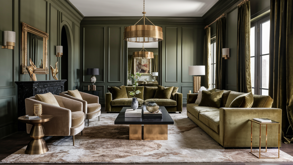 Olive green brings a rich, organic elegance, while muted gold adds a touch of understated luxury. This combination is perfect for creating a refined yet cozy ambiance. Use olive green on walls, accent chairs, or drapery, while incorporating muted gold through metallic hardware, light fixtures, or decorative accessories. The blend of deep, earthy tones with warm metallics exudes a timeless sophistication that feels both inviting and upscale.