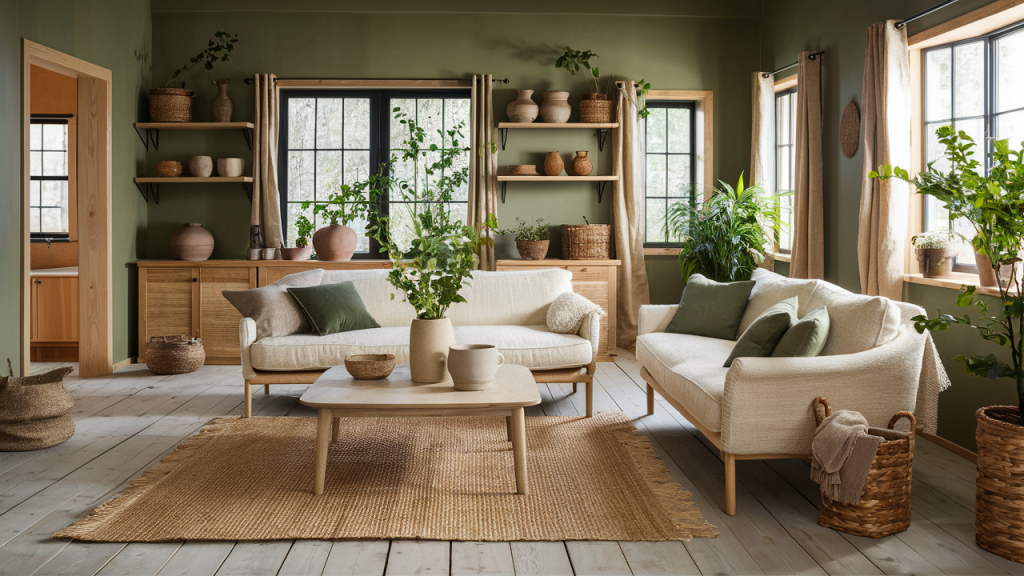 6. Forest Green and Light Wood Tones
