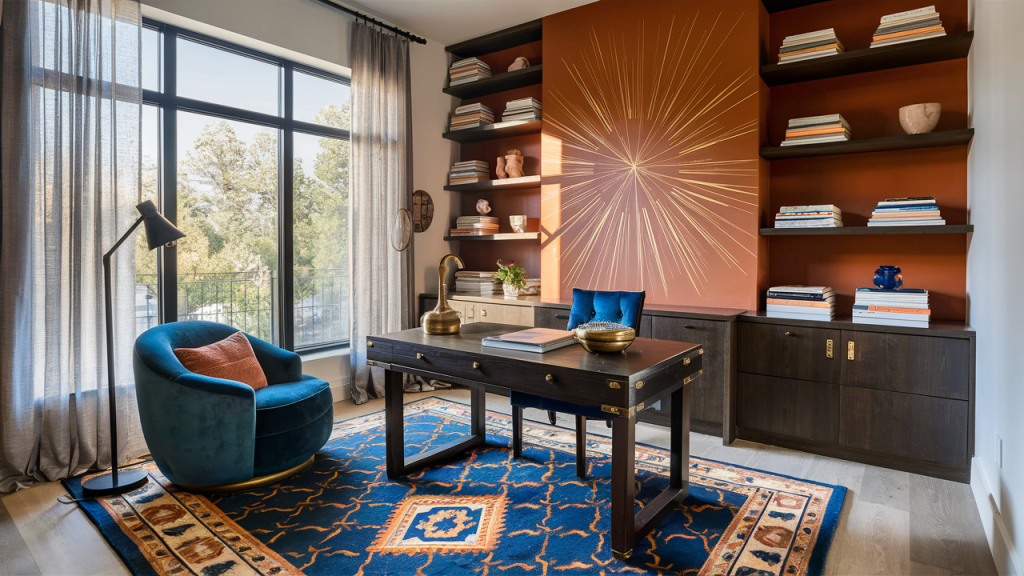 Burnt orange exudes warmth and vibrancy, while cool slate blue provides a soothing contrast. This combination blends energy with calm, making it perfect for spaces that feel both lively and grounded. Use burnt orange in smaller doses, like accent chairs, rugs, or decorative pillows, while slate blue serves as the dominant color on walls or sofas. The mix of warm and cool tones creates a dynamic, stylish interior with a refined yet approachable feel.