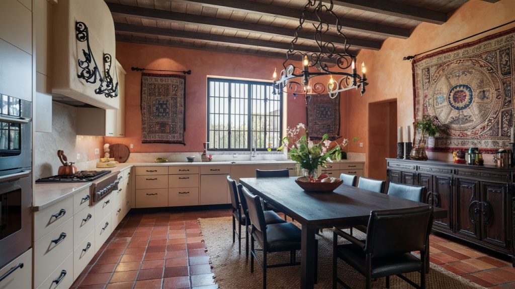 Wrought iron is a key element in Spanish décor, bringing strength and elegance to the space. Incorporate it through light fixtures, bar stools, pot racks, or cabinet hardware in black or dark bronze finishes. These bold, durable accents enhance the rustic charm and add a touch of old-world sophistication, perfectly complementing the warm tones and textures of a Spanish-inspired kitchen.