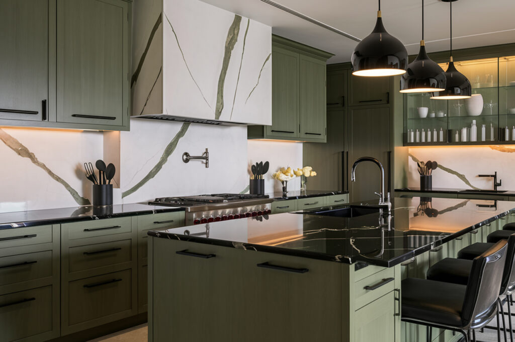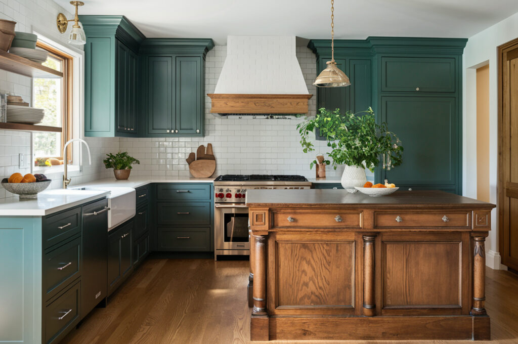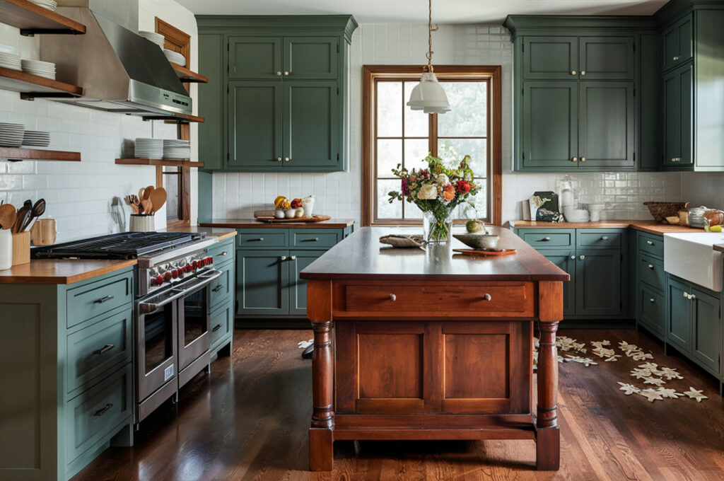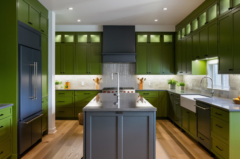 For those who love bold, moody interiors, forest green cabinets deliver a rich, dramatic effect. This deep hue exudes elegance and pairs seamlessly with crisp white marble countertops, brass fixtures, and warm wood tones. When combined with ample lighting and reflective surfaces, forest green kitchens feel cozy yet luxurious. This shade works exceptionally well in high-ceilinged kitchens or those with large windows that allow natural light to balance the depth of the color. It’s a choice that adds personality while maintaining a refined aesthetic.