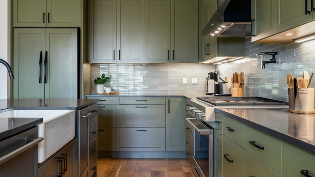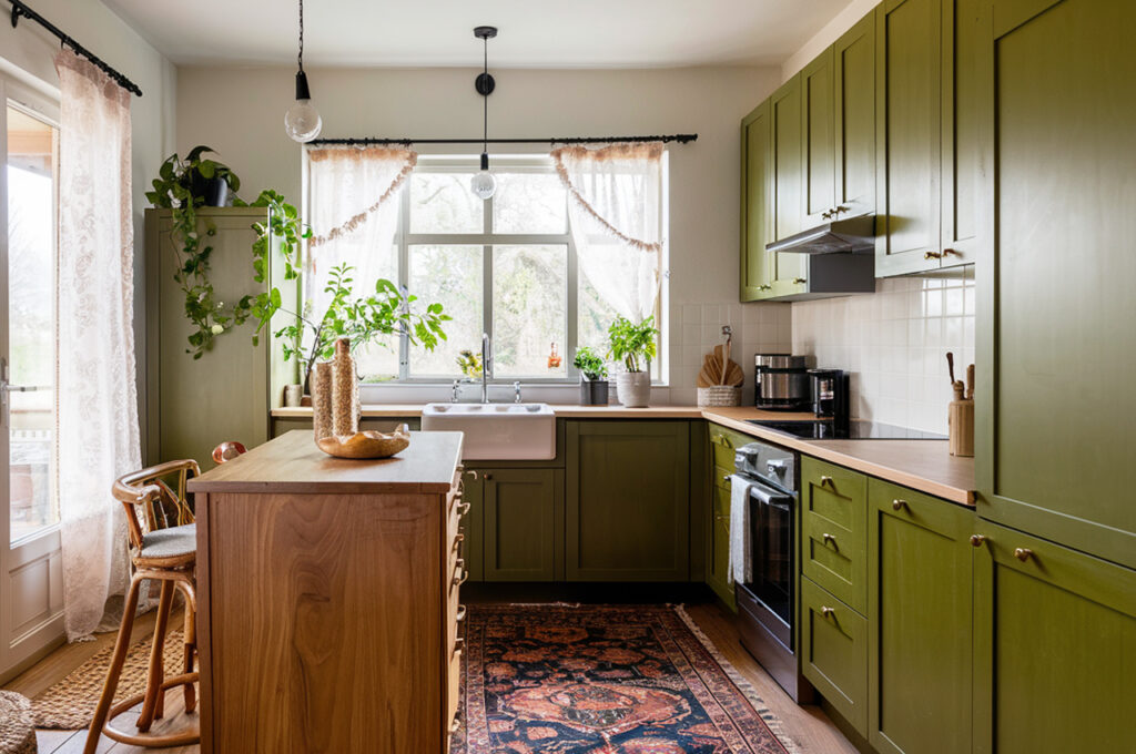Olive green cabinets introduce a natural, earthy aesthetic that blends well with rustic, farmhouse, or Mediterranean-inspired kitchens. The muted green tone pairs beautifully with terracotta tiles, butcher block countertops, and open shelving. Unlike brighter greens, olive exudes a subtle warmth that feels inviting and grounded. This hue works well in both contemporary and vintage-style kitchens, offering a sophisticated yet down-to-earth appeal that enhances the coziness of the space.