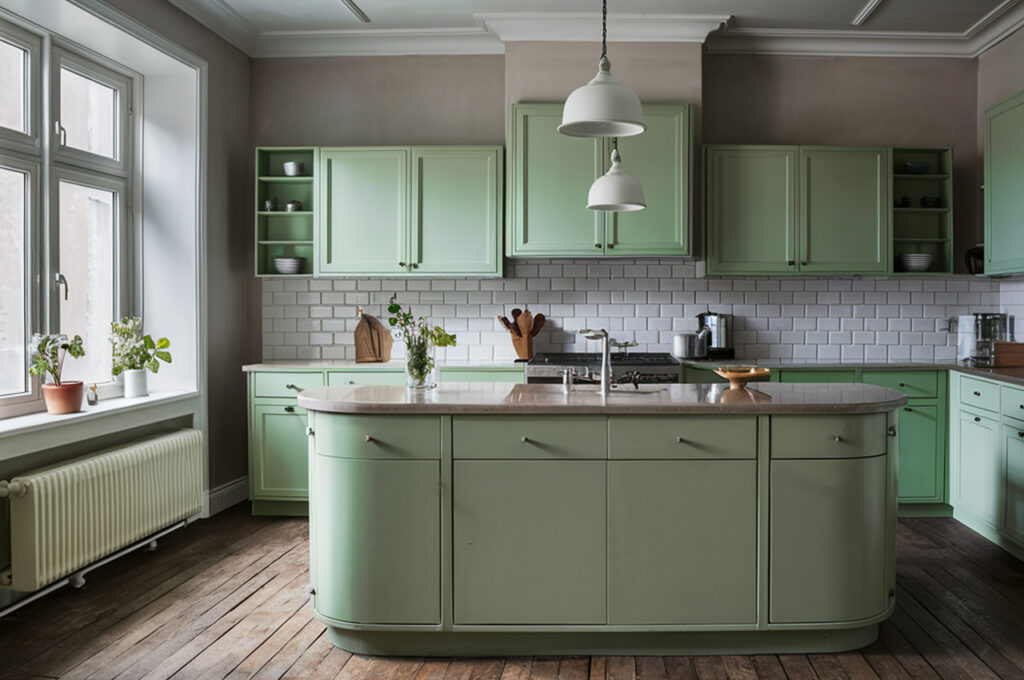 Pistachio green cabinets offer a playful nod to mid-century design, infusing kitchens with a subtle yet distinctive retro flair. This pastel shade is soft enough to keep the space feeling open while adding just the right amount of personality. Paired with white tile backsplashes, wooden accents, and sleek brass hardware, pistachio green creates a fresh and inviting atmosphere. It’s a fantastic choice for those who want a pop of color without overwhelming the space.