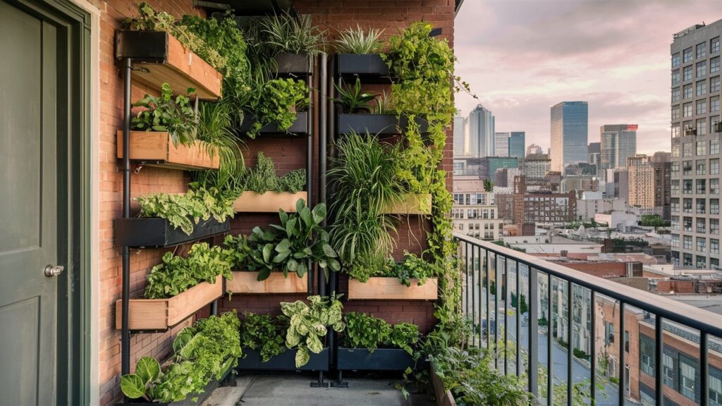 Living in urban spaces often means limited access to greenery, but a vertical garden can transform even the smallest balcony into a lush oasis. You can use vertical racks or plant shelves that allow you to grow multiple plants in a stacked arrangement. This will save space and give your balcony a lush, green look and you can even attach narrow planter boxes to the railing, wall, or even on the sides of the balcony. These can hold a mix of flowers, herbs, or succulents.