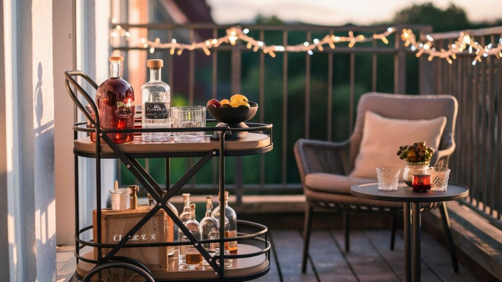 A mini bar cart in a small balcony can be a stylish and functional addition, perfect for entertaining or enjoying a drink outside. Look for a small, narrow cart or a rolling cart that can be tucked away when not in use. Outdoor-friendly materials are essential for durability. Stainless steel or powder-coated steel is a good option to resist the elements. Choose a cart with Lockable wheels which can help stabilize the cart when stationary. Use a tiered design with at least two or three shelves. The top shelf could be for glasses, cocktail shakers, and garnishes, while the bottom can hold bottles or mixers. Decorate the cart with small plants, decorative bottles, or other outdoor accessories that suit your balcony’s theme.