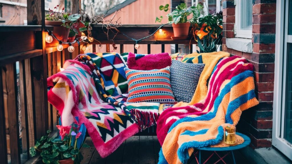 Colorful throw blankets add warmth, comfort, and style to a small balcony. They create a cozy atmosphere, making the space inviting for relaxation. Their vibrant colors enhance aesthetics, adding personality and charm. Lightweight and versatile, they can be used as seating covers, wraps on chilly evenings, or decorative accents. Easy to store and swap out, they allow for seasonal updates. Plus, they provide an affordable way to refresh the look of a compact outdoor space effortlessly.