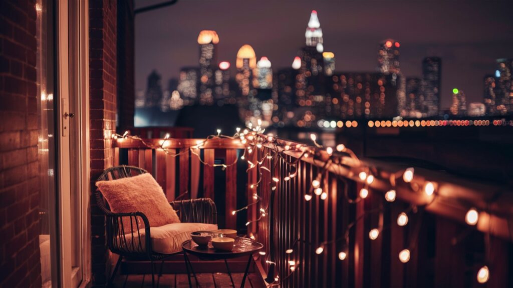 String lights and lanterns are popular lighting options for various settings. It creates a cozy, magical, and inviting atmosphere. String lights, in particular, are flexible and you can easily hung it along railings, walls, or across the ceiling, making them ideal for limited spaces as it will add character to space and will provide enough illumination for reading or relaxing and will help make a small balcony feel more spacious, functional, and visually appealing without taking up much room.