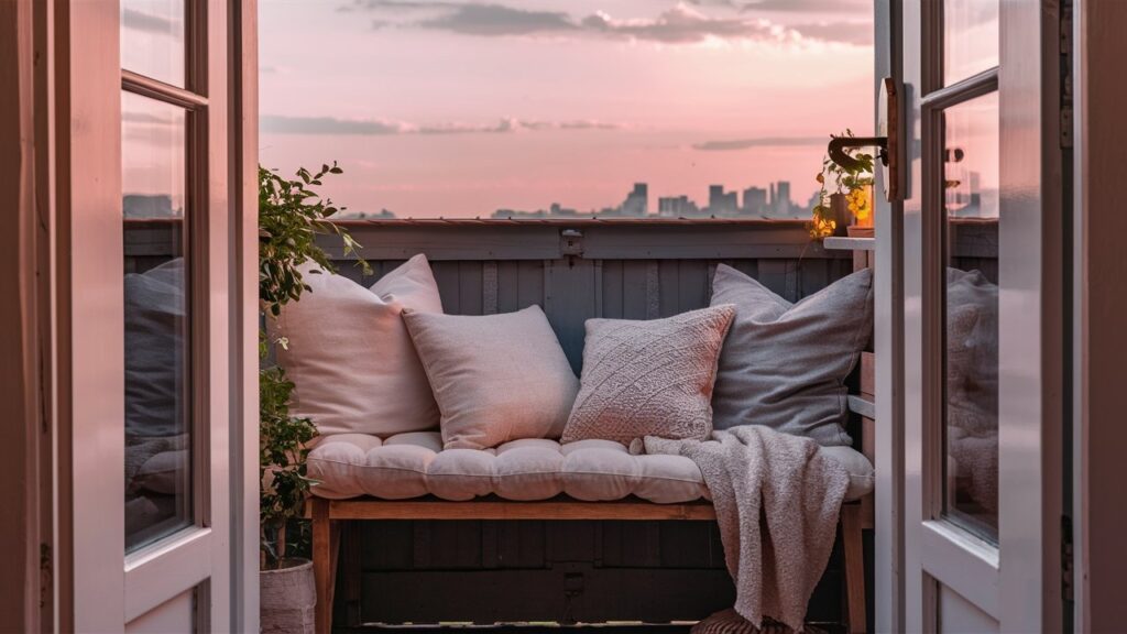 Creating a cozy seating area on a small balcony is all about maximizing comfort while making efficient use of space. It can create a relaxing retreat. Use weather-resistant cushions for durability. Mix and match different sizes and textures for a warm, inviting feel. Compact seating with cushions helps maximize the available space without feeling cramped. It can serve as a reading nook, mini lounge, or even a workspace. Floor seating with oversized pillows or a small hammock can maximize space. Use weather-resistant fabrics for durability.