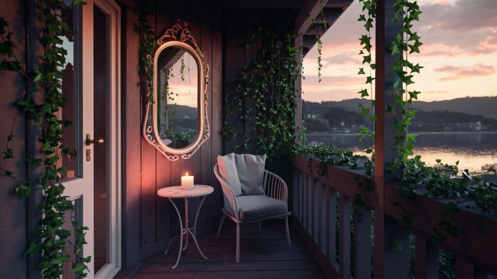 Using a mirror in a small balcony can make the space feel larger, brighter, and more stylish. Place a large mirror on one wall to make the balcony feel more open. A well-placed mirror can make a small balcony feel more open and spacious by reflecting light and surroundings. A stylish mirror can enhance the decor, making the balcony look more elegant and inviting. If positioned correctly, a mirror can reflect a garden, skyline, or cityscape, giving you a more scenic view. At night, mirrors can reflect decorative lighting (like fairy lights or lanterns), adding warmth and charm to the space. Hang a mirror behind potted plants or vertical gardens to create a lush, infinite effect. Choose an outdoor-friendly or acrylic mirror to avoid damage from moisture.