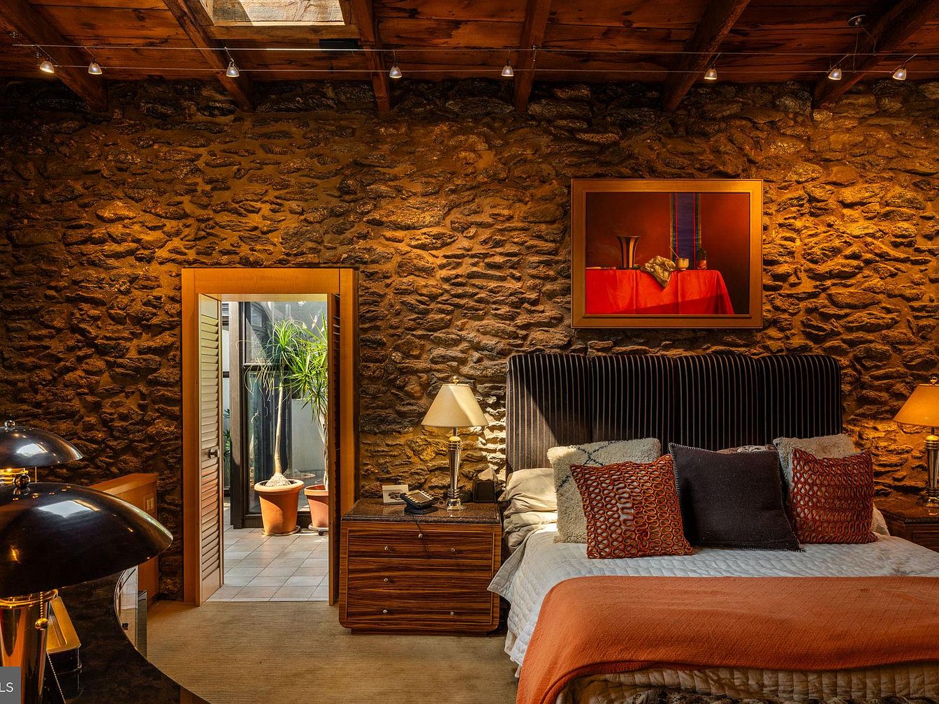 This cozy bedroom features a striking exposed stone wall creating a warm, rustic ambiance. The wooden ceiling beams enhance the natural texture and complement the earthy tones of the stone. A plush bed with an elegant striped headboard anchors the room, adorned with patterned and textured pillows in hues of burnt orange, brown, and beige. Matching wooden nightstands flank the bed, each topped with classic table lamps emitting soft, ambient light. An eye-catching still-life painting with rich reds hangs above the headboard. A doorway framed in wood leads to a small tiled indoor garden space with potted greenery, bringing a touch of nature indoors.