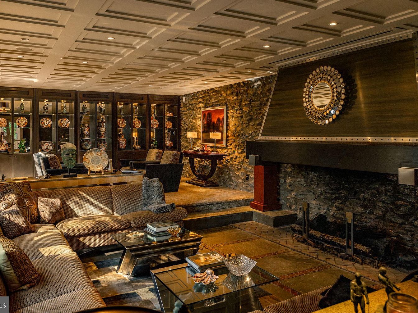 This living room offers a warm ambiance with a blend of rustic and elegant design elements. The focal point is a large stone fireplace with a dark wooden mantel, adorned by a round decorative mirror. A textured stone wall complements the fireplace and contrasts beautifully with the smooth wooden display cabinets filled with ornate pottery and porcelain pieces. The neutral-toned sectional sofa and armchairs provide comfortable seating, arranged around glass-top coffee tables. The coffered ceiling with recessed lighting adds architectural interest and a cozy yet sophisticated atmosphere to the space.