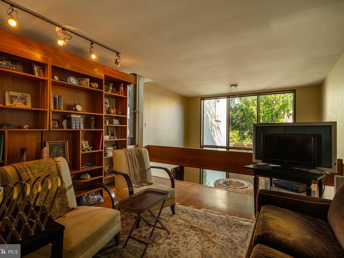 This intimate loft lounge features warm wood tones and a rich, inviting color palette. A built-in bookshelf, filled with various knick-knacks, framed photos, and books, runs along one wall, adding a personalized touch. Vintage-style armchairs upholstered in a muted yellow fabric face inward around a small, foldable wooden table, creating a casual seating area. The dark brown velvet couch contrasts softly with the lighter furniture pieces. The room is illuminated by a track of adjustable spotlights and natural light pouring through a large window, highlighting the greenery outside. The open railing offers views to the lower level, enhancing the airy, connected feeling. A modest entertainment setup includes a flat-screen TV perched on a black metal stand.