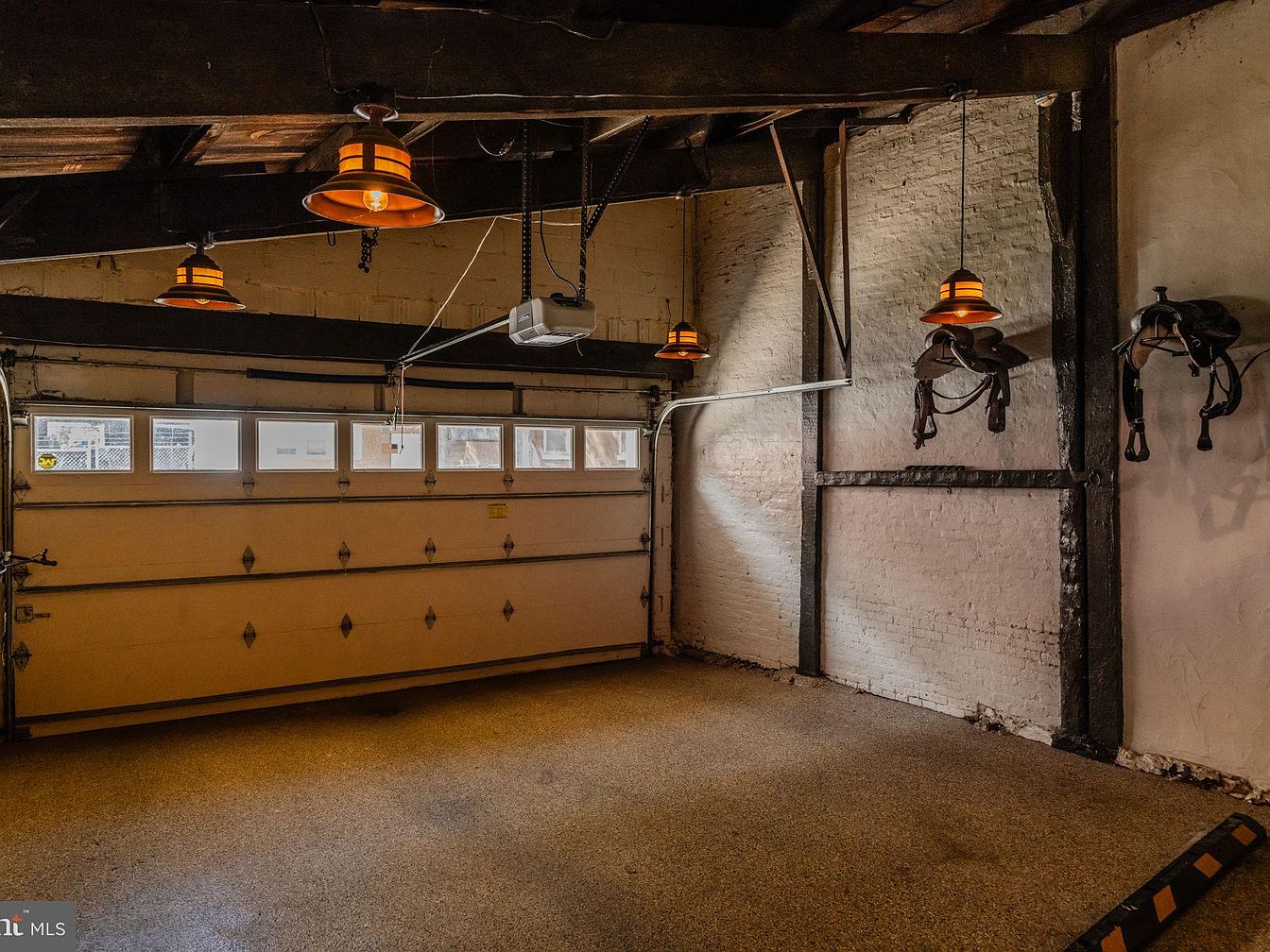 This garage space features a unique blend of rustic and industrial design. The walls are constructed with painted brick, accented by exposed dark wooden beams that run along the ceiling and frame the walls, adding texture and character. Warm amber pendant lights hang from the ceiling, casting a cozy, inviting glow across the space. The garage door is white with small rectangular windows along the top, allowing natural light to filter inside. Mounted saddles on the wall suggest equestrian interests, integrating heritage elements into the practical design. The speckled concrete floor completes the durable, masculine aesthetic.
