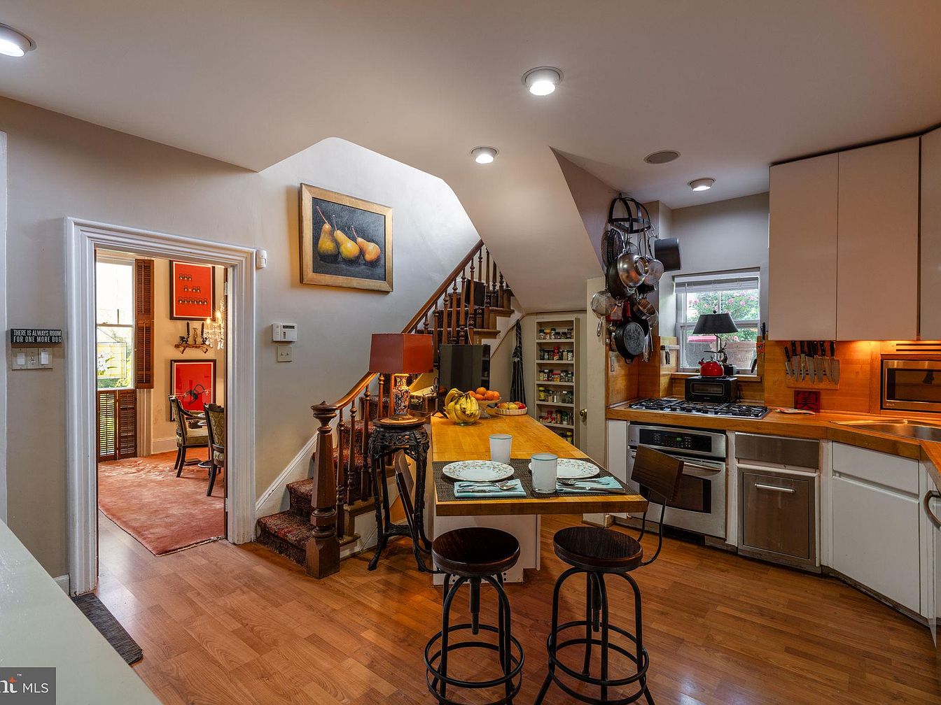 This kitchen area combines function and charm with a warm wooden countertop that extends into a cozy breakfast bar accompanied by two industrial-style swivel stools. The flooring matches the countertop’s wood tone, creating a harmonious flow. A spice rack is neatly organized in an alcove beneath the staircase, which features rich, dark wood railings and carpeted steps. Stainless steel appliances, including a dishwasher and an oven, are integrated into white cabinetry with a corner sink under a window framing garden views. Hanging pots and knives on magnetic strips emphasize practical, accessible storage in this inviting kitchen nook.