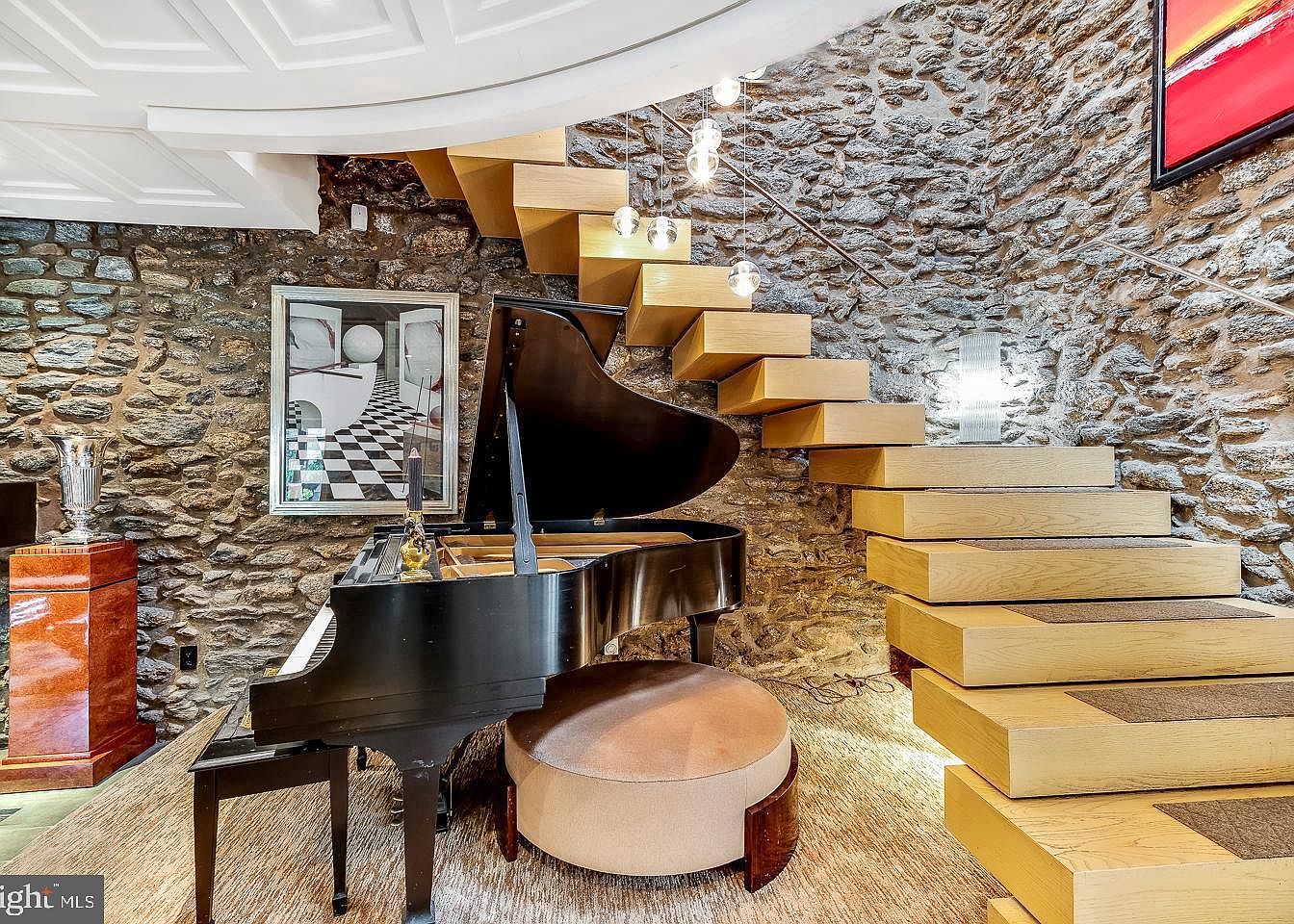 This unique corner serves as a sophisticated music nook beneath a modern floating staircase. The stairs, composed of thick, light wood planks, rise against an exposed textured stone wall, creating a striking juxtaposition of natural ruggedness and clean architectural lines. The black grand piano sits elegantly, complemented by a round, plush beige ottoman for seating. A contemporary cluster of glass pendant lights hangs above, casting gentle illumination. Nearby, a framed monochrome artwork and a glossy pedestal add artistic flair, blending rustic charm with modern elegance in this intimate, creative space.
