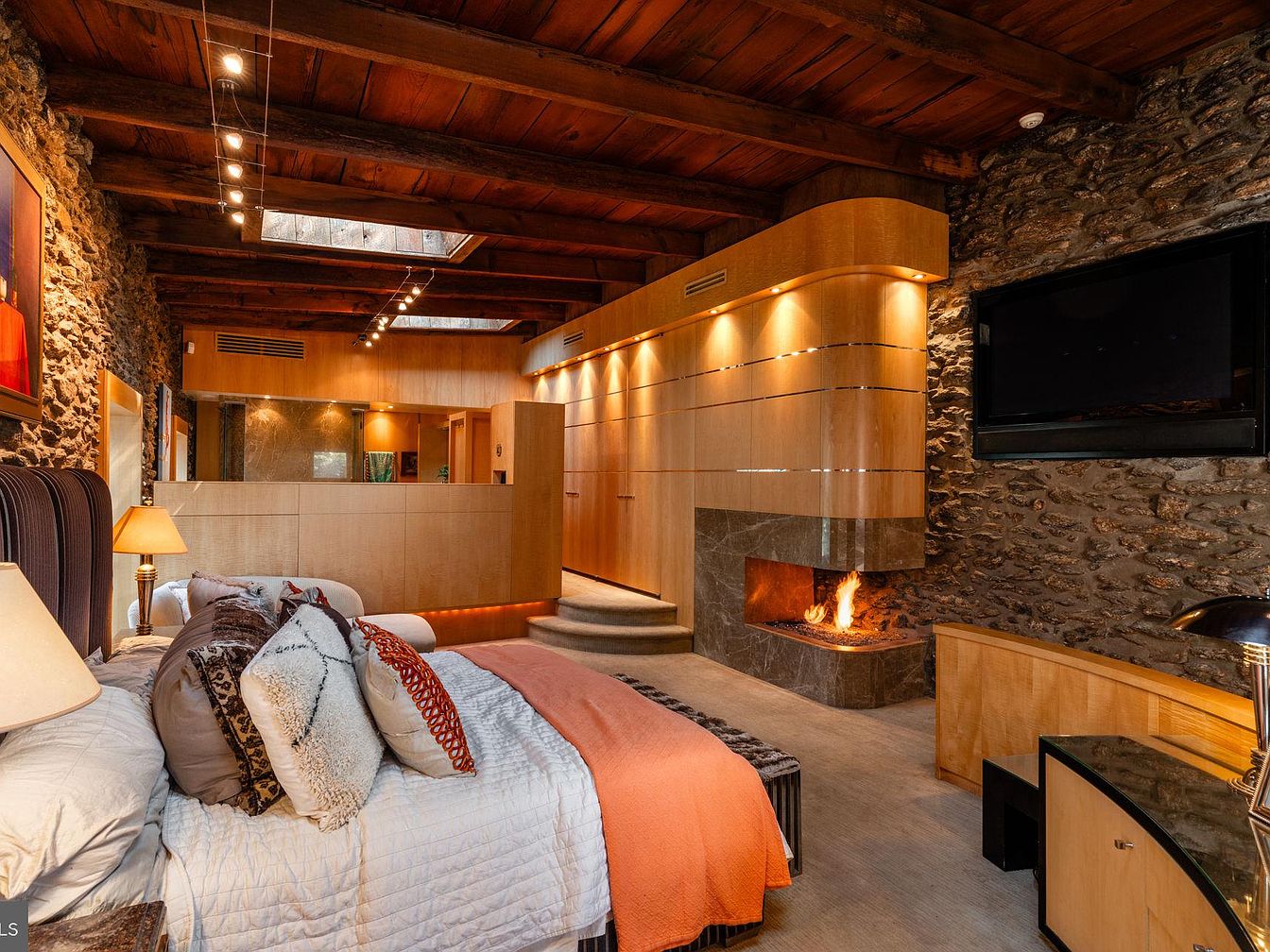 This cozy bedroom blends rustic charm with modern comfort, featuring exposed stone walls and a rich wooden ceiling with large beams. The bed, layered with textured and patterned pillows and a burnt orange throw, faces a wall-mounted flat screen TV above a sleek marble fireplace, adding warmth and ambiance. Soft carpeting cushions the floor. Along the side, curved light wood cabinetry with recessed lighting creates a sophisticated backdrop, complementing the natural stone and wood elements. Skylights above bring natural light, enhancing the warm tones and inviting atmosphere in this stylish retreat.