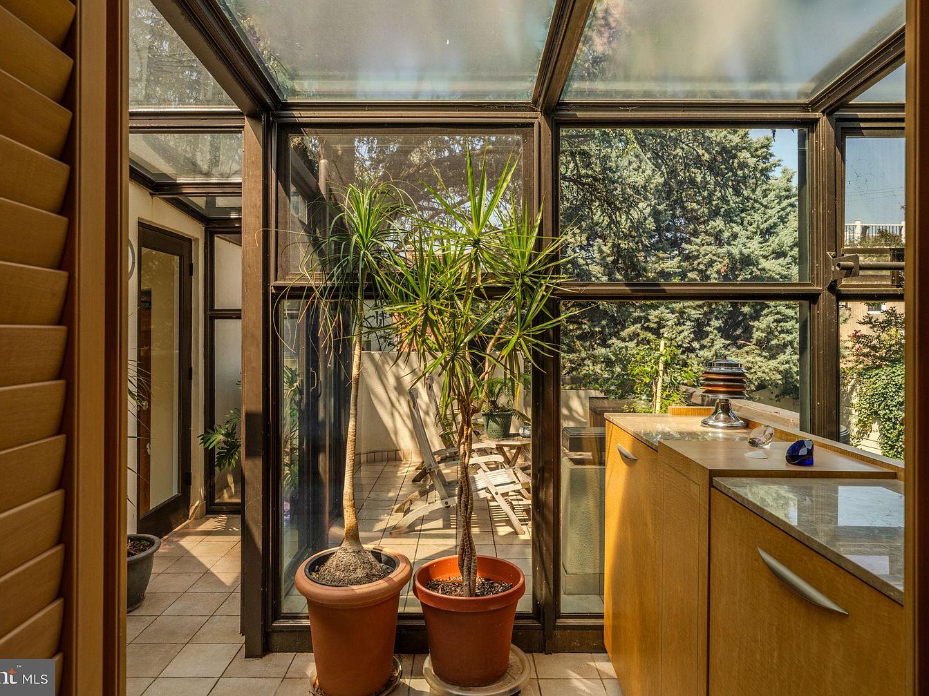 This sunroom nook features large glass panels and a glass ceiling that invite abundant natural light, creating a warm and airy atmosphere. The earthy tones of the terra cotta pots complement the natural wooden cabinetry with sleek silver handles and marble countertops, adding a touch of elegance. Two tall indoor plants provide a lively, green focal point while the tiled floor seamlessly blends with the outdoor patio visible beyond the glass. The overall design balances indoor comfort with the outdoors, making this a cozy, light-filled retreat for relaxation or casual conversation.