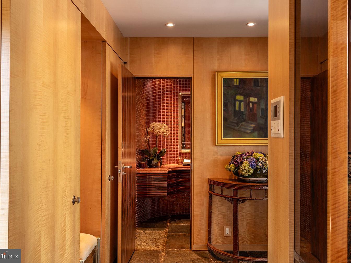 This warm hallway features smooth, light wood-paneled walls that create an inviting and cohesive flow. Built-in storage or seating is subtly integrated with polished door hardware. At the end of the hallway, a small powder room reveals walls covered in rich, reddish mosaic tiles paired with a striking wooden vanity that offers sculptural curves and a glossy finish. The floor is made of textured stone tiles, adding an earthy contrast to the warm woods and reds. On the right side, a half-moon console table holds a vibrant floral arrangement beneath a framed painting, bringing color and artistic detail to the space.