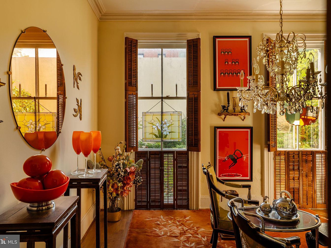 This cozy dining area features warm, muted yellow walls contrasted with rich wooden window shutters and dark furniture. Two large windows allow natural light to softly illuminate the space, with an intricate stained glass panel adding artistic charm. A classic crystal chandelier hangs centrally, bringing elegance and vintage flair. The furnishings include a small, round glass-top table with refined chairs, complemented by a polished silver tea set. Bright orange accents appear in decorative glassware and artwork, creating vibrant focal points that enhance the traditional aesthetic. Ornate detailing, like the gilded wall shelf and oval mirror, enrich the room’s character.