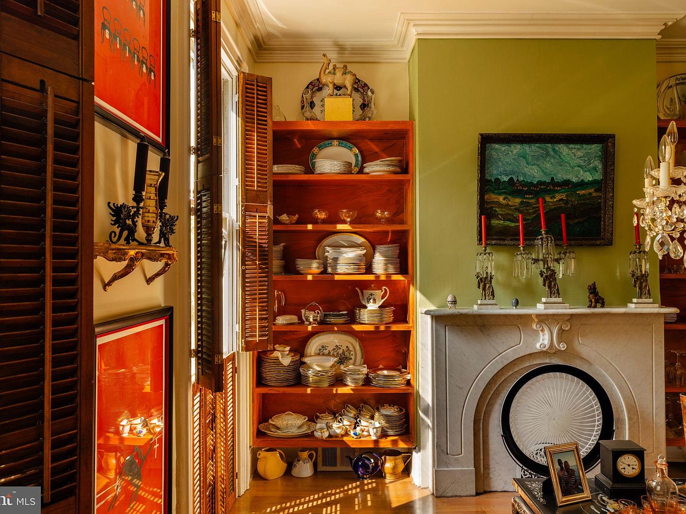 This cozy dining room corner blends classic charm with artistic flair. A built-in wooden shelf lined with fine china and glassware catches sunlight filtering through wooden shutters, adding warmth to the honey-toned hardwood floor. The adjacent marble fireplace features intricate carvings and a black fireback screen, topped with antique-style candelabras adorned with red candles. Above the mantel hangs an expressionistic landscape painting framed in dark wood. The walls are painted a muted sage green, complementing the natural wood and marble textures. Decorative pieces, including a golden bust and framed art, enhance the room’s elegant yet inviting atmosphere.