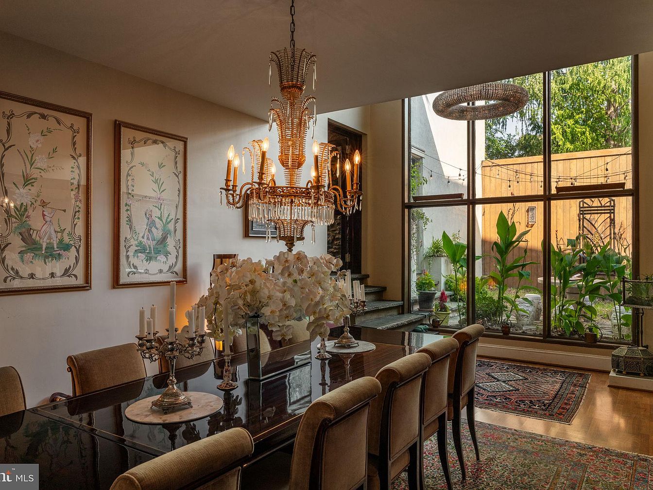 This elegant dining room features a long, polished dark wood table surrounded by upholstered beige chairs, perfect for hosting formal gatherings. A grand, crystal chandelier with an antique brass finish hangs centered above the table, casting a warm glow. The walls are adorned with two large framed vintage-style botanical prints, adding sophistication and a touch of artistic charm. Expansive floor-to-ceiling windows flood the room with natural light, offering a serene view of a lush outdoor garden with potted plants and wooden fencing, creating a harmonious blend of indoor and outdoor spaces. The area rug anchors the space with its intricate patterns, complementing the classic and cozy ambiance.