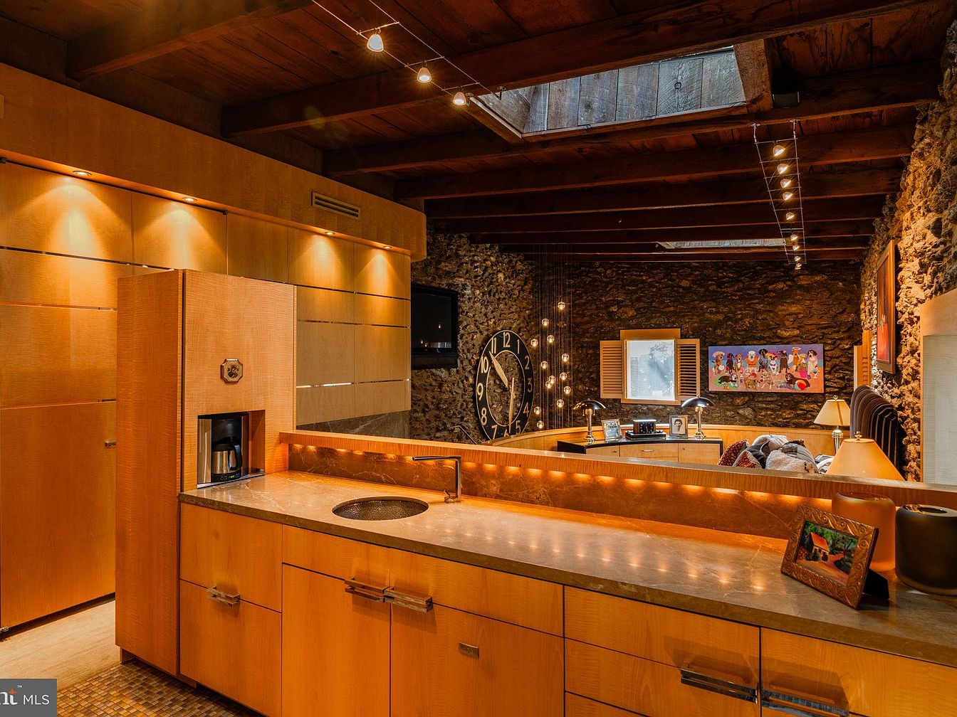 This kitchen features smooth, light wood cabinetry with integrated handles and a warm, polished countertop that includes a small, round sink. A built-in coffee maker adds convenience. The space seamlessly flows into a living area, visible through a reflective backsplash, where rustic stone walls and deep wood beams on the ceiling create a cozy, earthy ambiance. Modern track lighting and pendant bulbs highlight architectural details, while skylights bring natural light into the warmly lit space. The blend of natural textures and warm tones gives the kitchen and adjoining living room a sophisticated yet inviting feel.