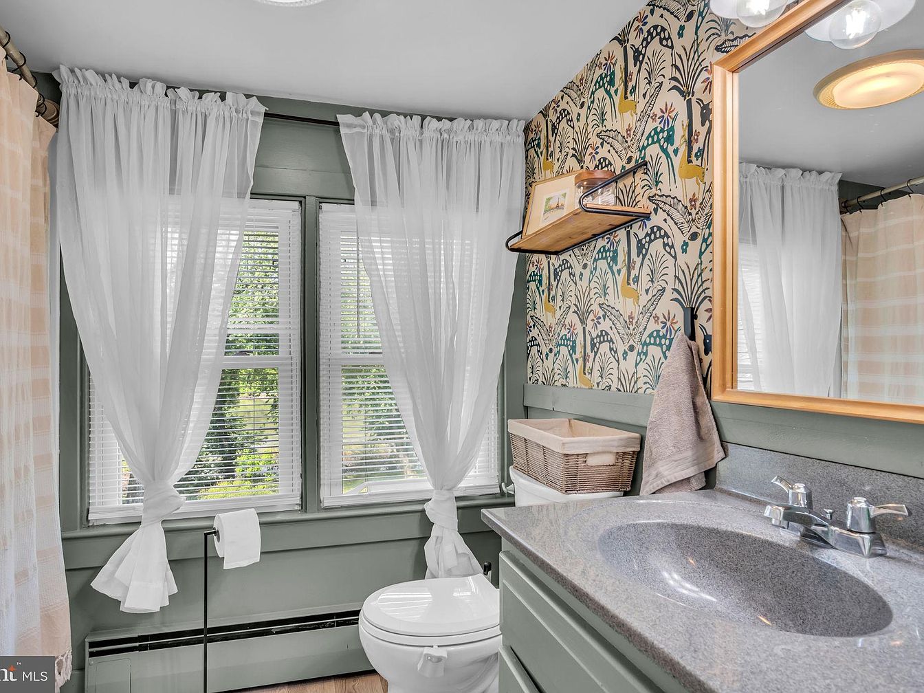 This bathroom features a charming corner with sage green woodwork around the windows and cabinetry, creating a soothing and earthy ambiance. Three windows dressed with soft, white sheer curtains tied in the middle allow natural light to gently fill the space, enhancing its airy feel. A quirky wallpaper with colorful animal and botanical patterns adds playfulness and character on one wall, contrasting beautifully with the more muted tones. The grey granite countertop with an oval sink is complemented by a large framed mirror, while a small wooden shelf above the toilet holds decorative and functional items, bringing warmth to this cozy, well-balanced bathroom retreat.