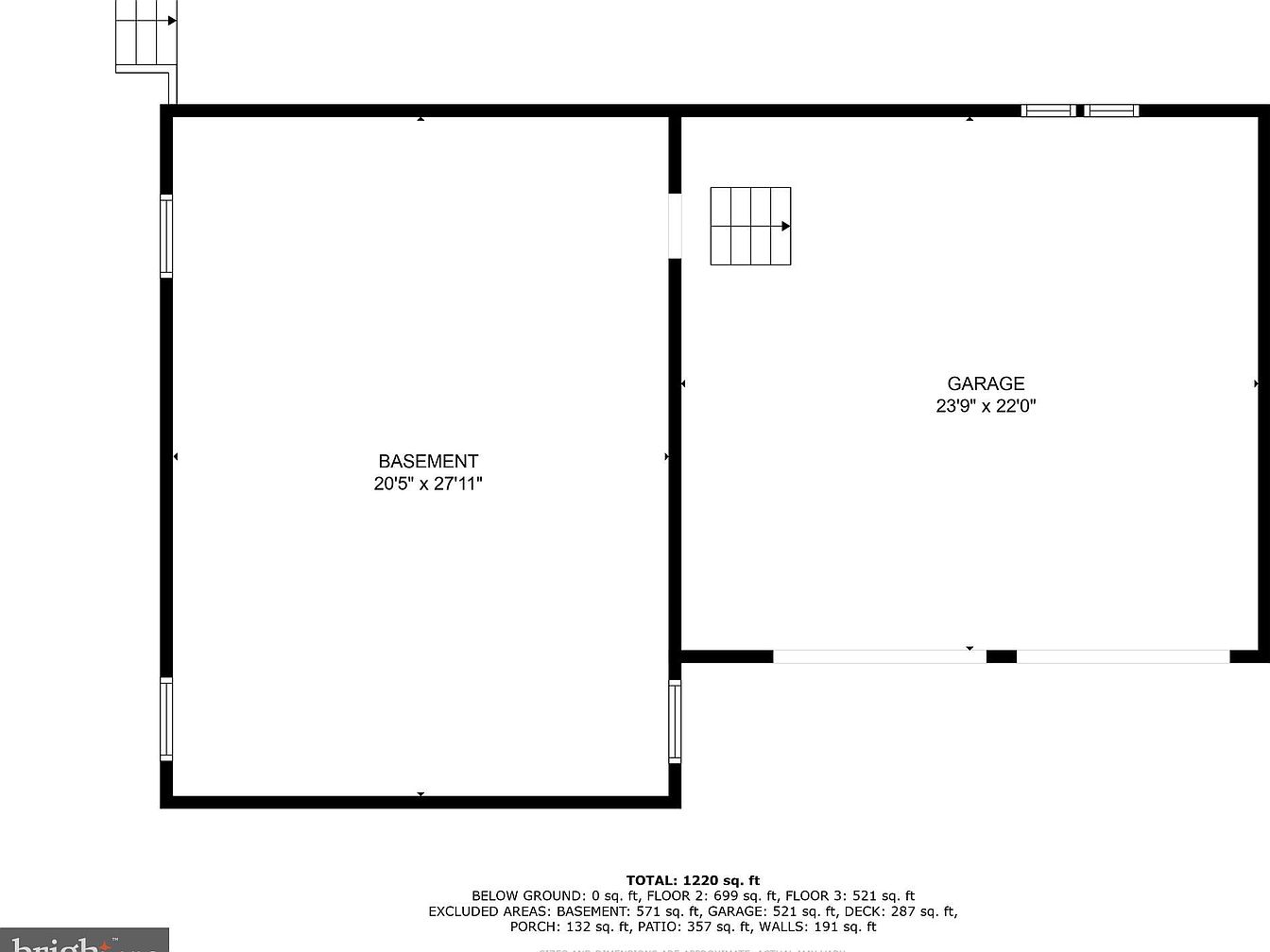 This floor plan highlights the underground basement and adjacent garage area of the home. The basement measures approximately 20 feet 5 inches by 27 feet 11 inches, offering a spacious open area that can accommodate various uses such as storage, recreation, or additional living space. Adjoining it is a large garage sized about 23 feet 9 inches by 22 feet, suitable for multiple vehicles and extra storage. The layout features clear separation between the basement and garage with interior stairs leading upward, optimizing accessibility while maintaining functional organization in the home’s lower level.