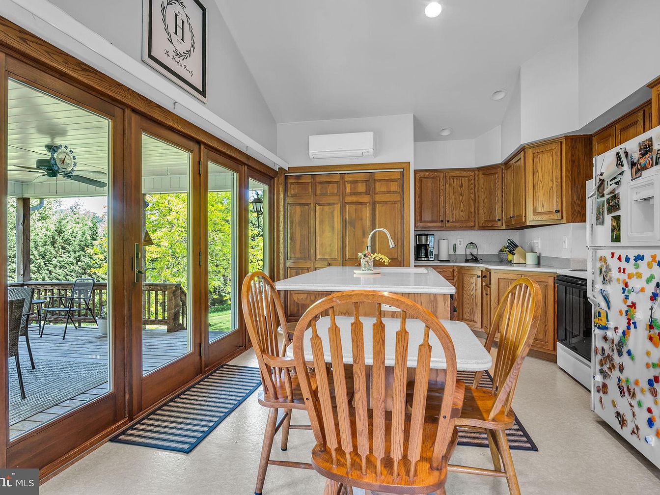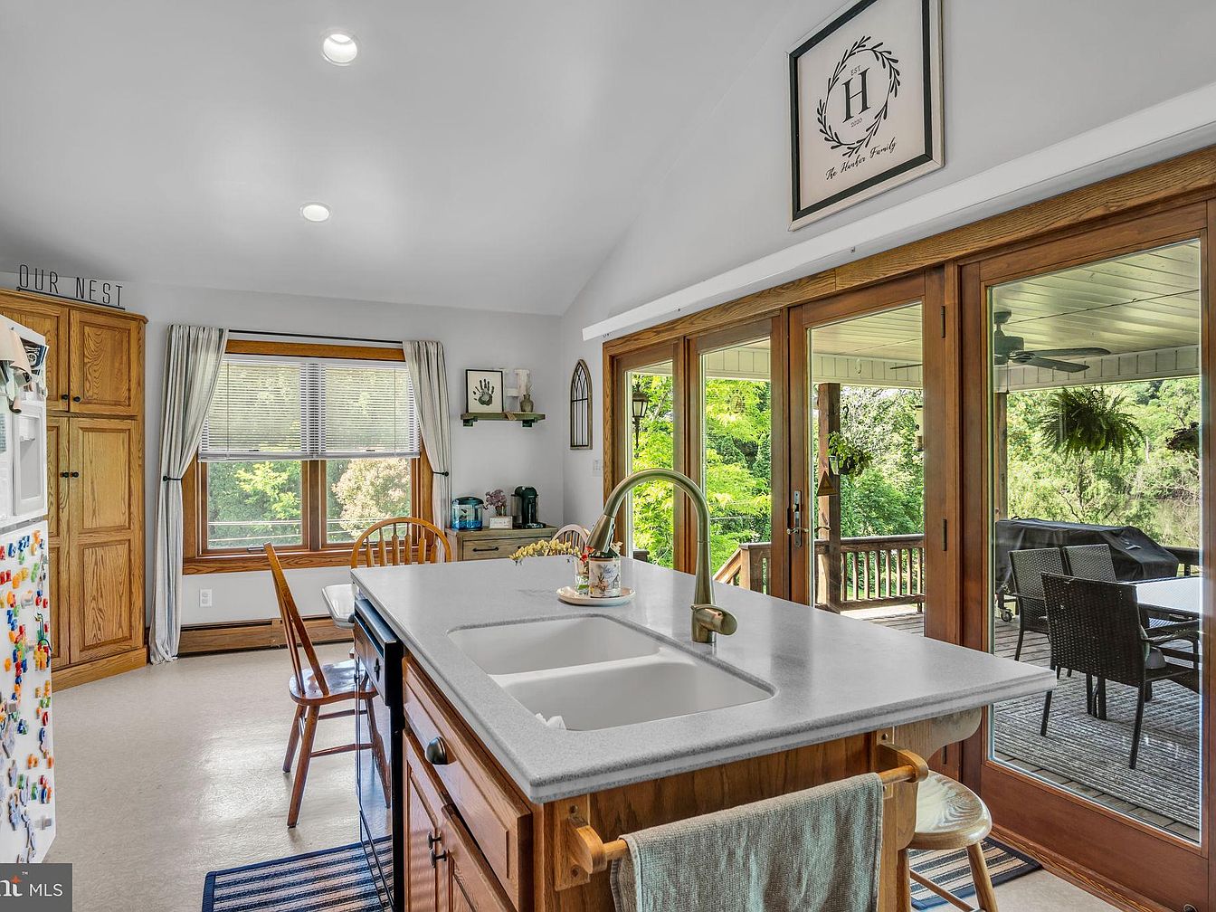 This cozy kitchen features natural wood cabinetry arranged in an L-shape, providing ample storage and a warm, traditional feel. The countertops are light in color, complementing the wood tones and adding brightness. An island with a built-in sink doubles as a casual dining table, surrounded by classic wooden chairs. Large sliding glass doors with rich wood frames open to an outdoor deck, enhancing natural light and connecting this space with the lush greenery outside. The white refrigerator, adorned with colorful magnets, and a coffee maker on the counter lend a lived-in, family-friendly atmosphere. Clean white walls and a high ceiling maintain an airy and welcoming ambiance.