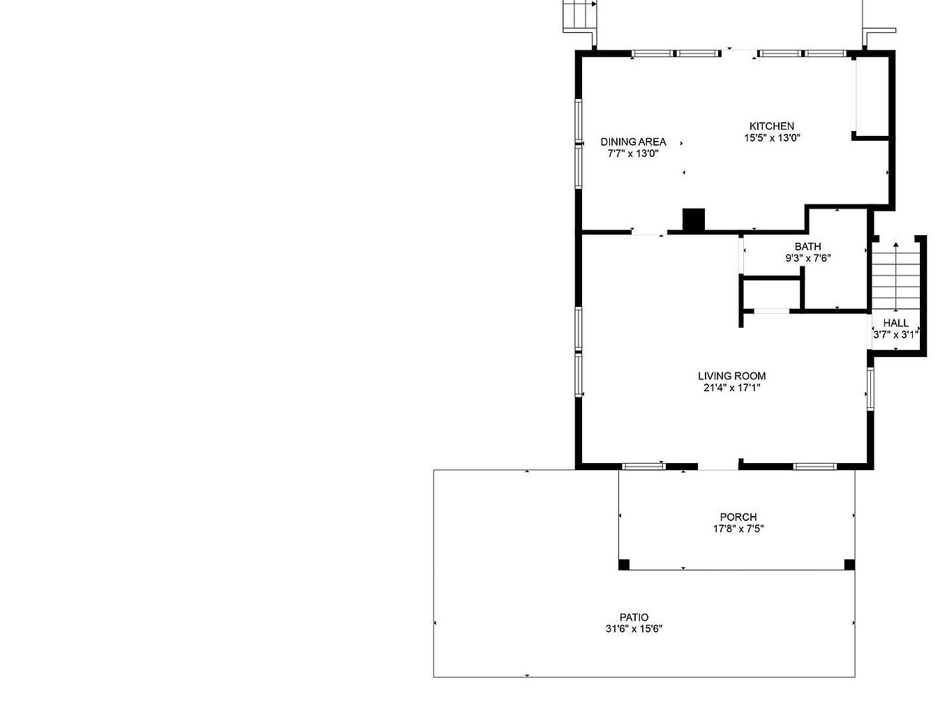 This is a detailed floor plan of the main level of the home, showcasing an open layout with clearly defined spaces. The living room, measuring 21’4″ x 17’1″, anchors the space, providing a large, flexible area adjacent to the kitchen and dining areas. The kitchen is a generous 15’5″ x 13’0″, connected to a smaller dining area that measures 7’7″ x 13’0″ for casual or formal meals. A convenient bathroom is centrally located near the hall and stairway entrance. The plan extends outdoors to a porch (17’8″ x 7’5″) and a spacious patio area (31’6″ x 15’6″), inviting indoor-outdoor living and entertaining possibilities.