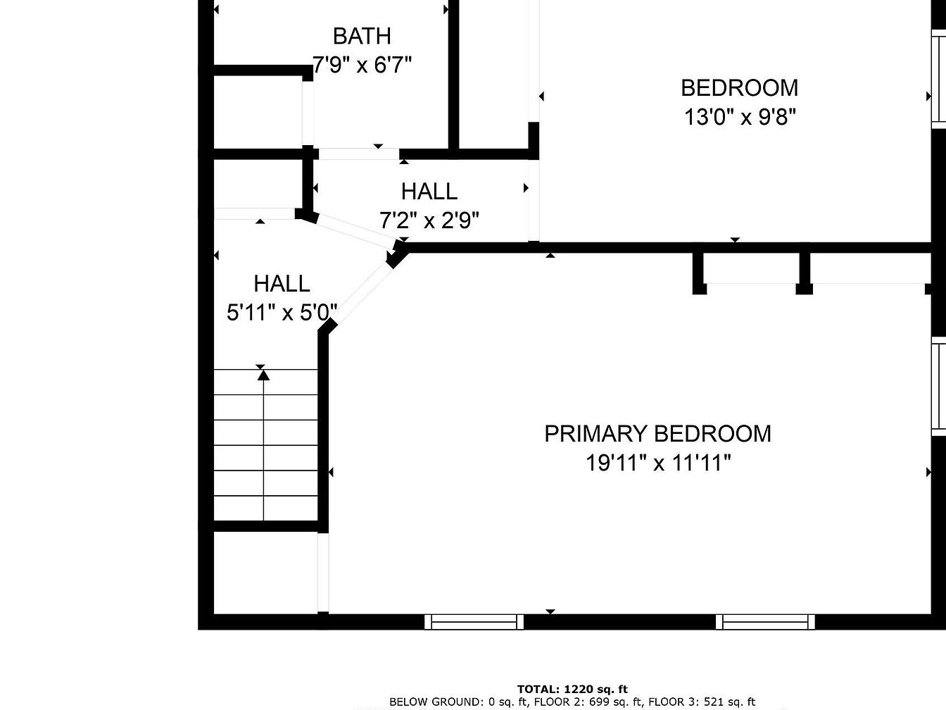 This floor plan highlights a spacious primary bedroom measuring nearly 20 by 12 feet, positioned adjacent to a smaller bedroom and bathroom. The primary bedroom’s ample size allows for versatile furniture arrangements and comfort. The design includes two halls connecting the stairway to the bathroom and bedrooms, ensuring a smooth flow between spaces. The bath, compact yet functional, complements the bedrooms. The solid lines and clear dimensions outline a simple, practical layout emphasizing privacy and accessibility while maintaining efficient use of space in a moderate-sized home totaling 1,220 square feet.
