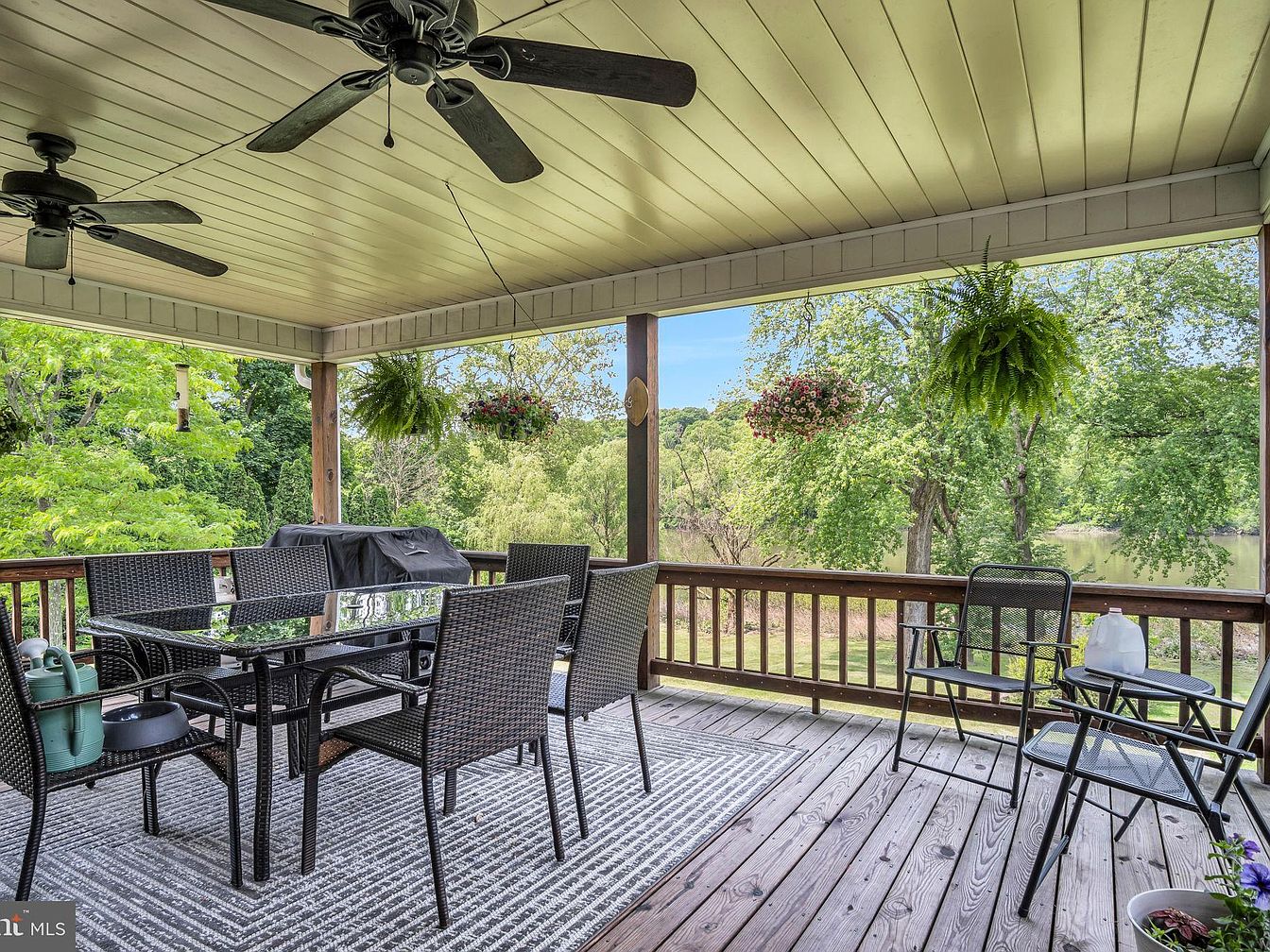 This outdoor porch space is designed for relaxed dining and socializing with a clear view of the surrounding greenery and water in the distance. The wooden deck flooring complements the natural setting, bordered by sturdy wooden railings. A glass-top dining table with six woven black chairs sits centered on a large striped area rug, fostering a cozy yet functional vibe. Two black ceiling fans hang from the paneled cream ceiling, enhancing comfort on warm days. Hanging plants contribute lush greenery, harmonizing with the natural backdrop while a grill suggests this is a perfect spot for alfresco meals and gatherings.