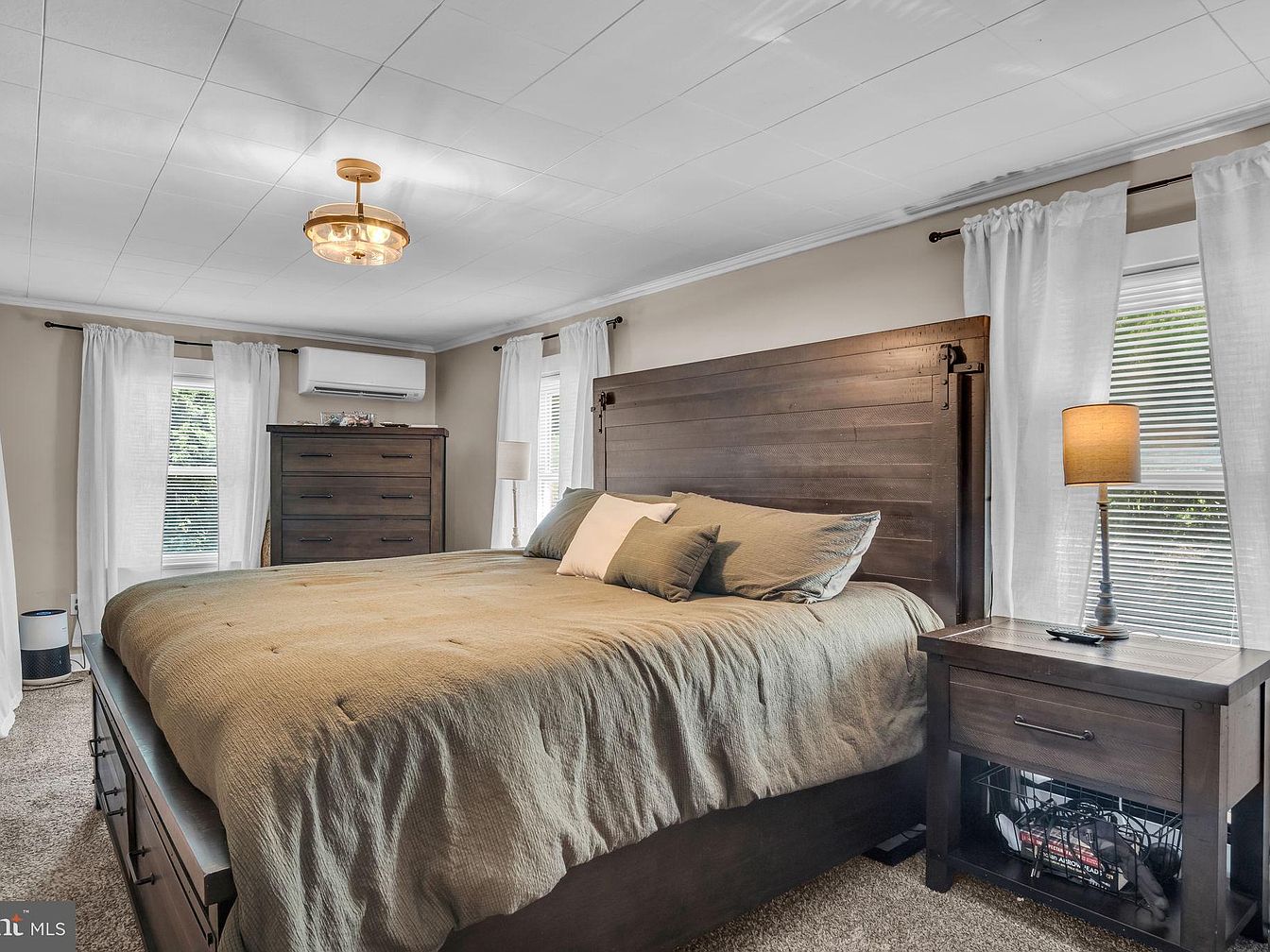 This master bedroom exudes a warm, inviting ambiance with its neutral taupe wall color paired with white trim and ceiling. The centerpiece is a large wooden bed frame with a prominent headboard exhibiting rustic, plank-style detailing in a dark stain. Coordinating furniture includes a matching nightstand with a single drawer and an open shelf that holds books, beside a modern table lamp with a beige shade. Opposite the bed, a tall dresser with clean lines provides ample storage. Natural light filters through three windows dressed with soft white curtains, enhancing the cozy, minimalist feel. A plush beige carpet grounds the room, while a contemporary ceiling light fixture adds a subtle modern touch. A discreet wall-mounted air conditioning unit ensures comfort without disrupting the room’s aesthetic.