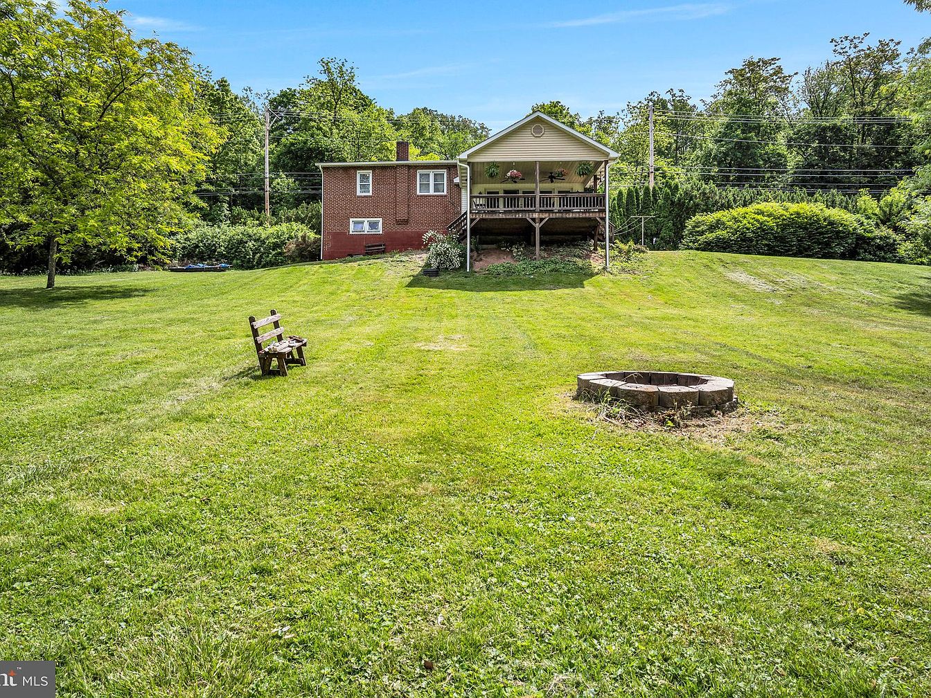 This expansive backyard features a gently sloping lawn with vibrant green grass that creates an inviting outdoor space. At the center foreground, a circular stone fire pit offers a gathering spot for evening relaxation. A weathered wooden bench sits off to the side, adding rustic charm and additional seating. The back of the house showcases a covered porch with hanging potted plants, supported by wooden posts, providing shade and a cozy area to enjoy nature. Lush trees and dense shrubbery border the yard, lending privacy and a natural, peaceful ambiance to this serene outdoor retreat.