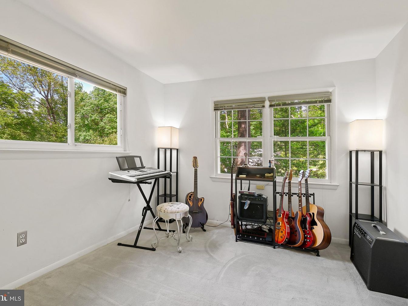 This serene music room features a clean, minimalist design with white walls and soft gray carpeting, providing a bright and inviting atmosphere. Natural light floods in through two large window sets, highlighting the lush greenery outside and creating a peaceful backdrop for creativity. The room contains musical instruments arranged neatly along one corner, including electric guitars, an acoustic guitar, and a keyboard on a black stand. Two tall, narrow lamps with white rectangular shades flank the instruments, adding gentle, warm lighting. A vintage-style cushioned stool completes the cozy yet functional setup for music practice and relaxation.