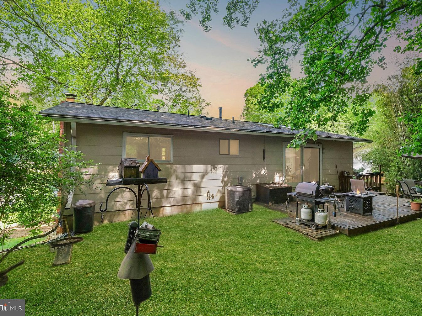 This backyard space features a cozy wooden deck attached to the rear of the house, designed for outdoor cooking and relaxation. The decking area is equipped with a grill and a fire pit table, perfect for entertaining guests. The house’s exterior wall is painted in a neutral taupe shade, with two windows and a sliding glass door allowing easy access to the deck. Surrounding the yard are mature trees that provide ample shade and privacy, while the neatly maintained lawn adds a fresh green contrast. Practical elements like an air conditioning unit and storage boxes maintain functionality without disrupting the natural and welcoming ambiance.