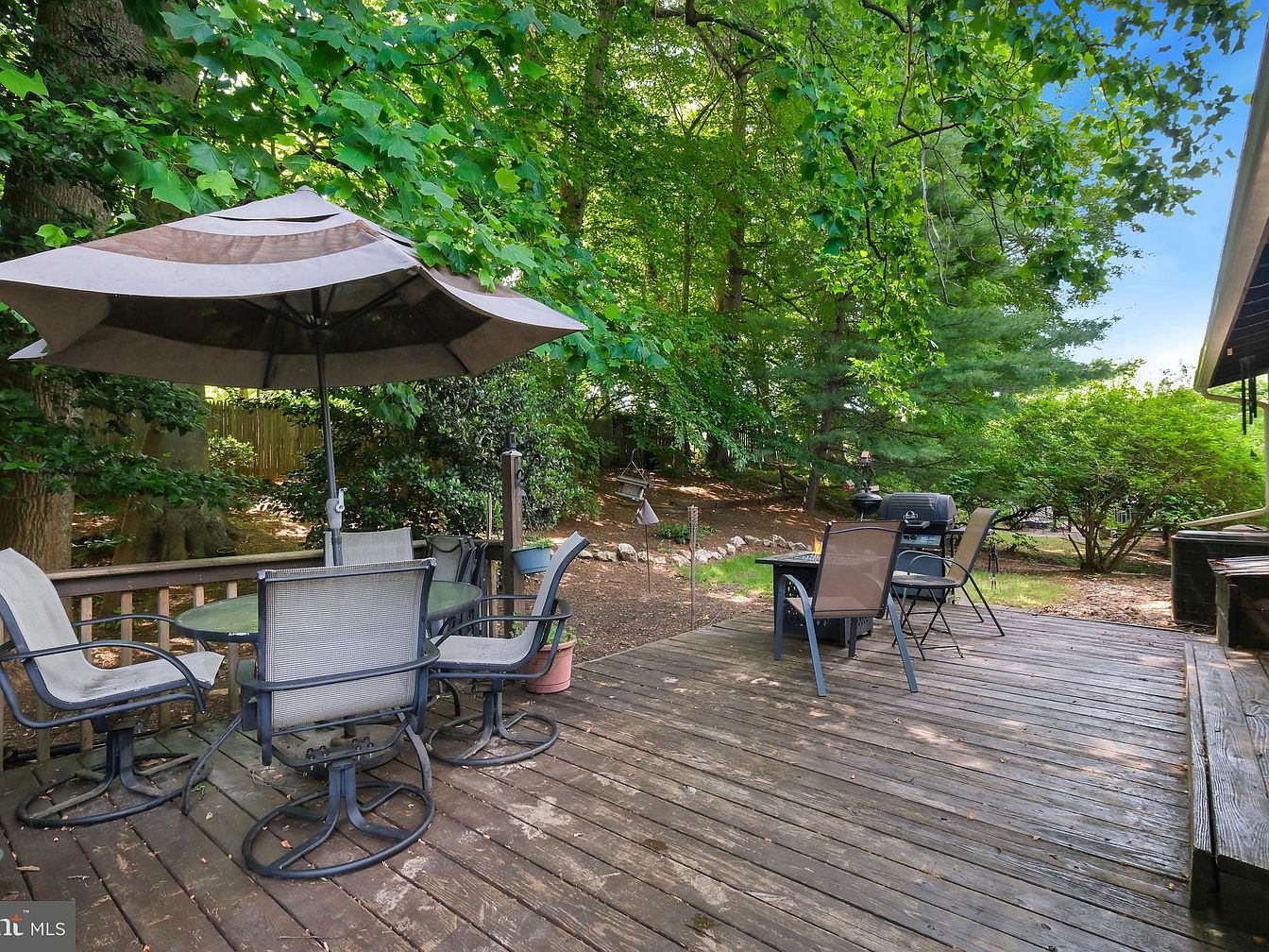 This spacious wooden deck extends into a serene backyard surrounded by lush green trees and shrubs, creating a peaceful outdoor retreat. The deck features a round glass-topped table with four cushioned swivel chairs and a large beige umbrella, providing shaded seating for outdoor dining or relaxation. Nearby, two additional chairs flank a black grill, indicating a dedicated grilling and entertaining area. The natural wood flooring has a weathered texture, enhancing the casual, rustic charm of the space. The surrounding greenery adds privacy and a refreshing connection to nature, perfect for leisurely gatherings.