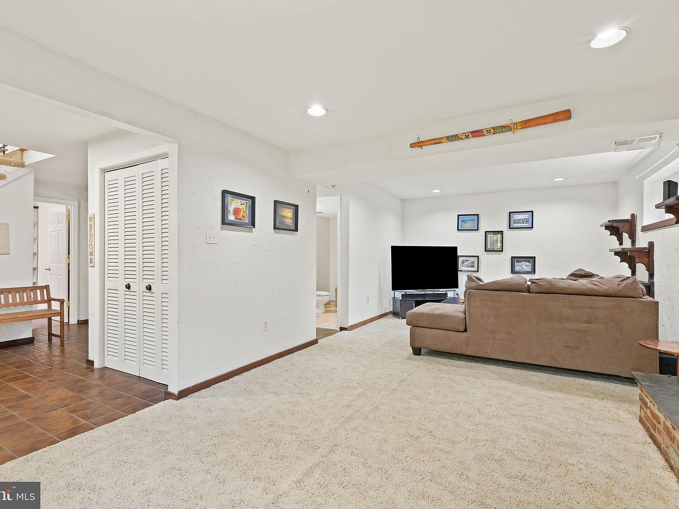 This cozy basement family room features a soft beige carpet that contrasts nicely with the white textured walls and ceiling, creating a bright and inviting atmosphere. A large brown sectional sofa faces a flat-screen TV on a sleek black stand. The wall decor includes framed pictures arranged in a grid and a decorative wall hanging above a support beam. The space opens to a tiled entryway with a wooden bench and staircase access visible. The use of simple furniture and subtle art gives the room a warm, comfortable, and functional feel.